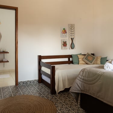 1 cama queen, 1 sofá cama com 2 colchões de solteiro, banheiro privativo. Até 4 pessoas.