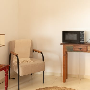 1 cama queen, 1 sofá cama com 2 colchões de solteiro, equipado com frigobar e microondas, banheiro privativo. Até 4 pessoas.